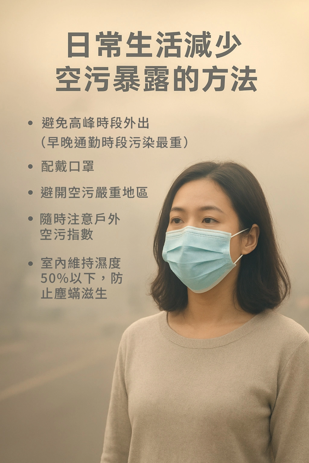 - 避免高峰時段外出(早晚通勤時段污染最重)