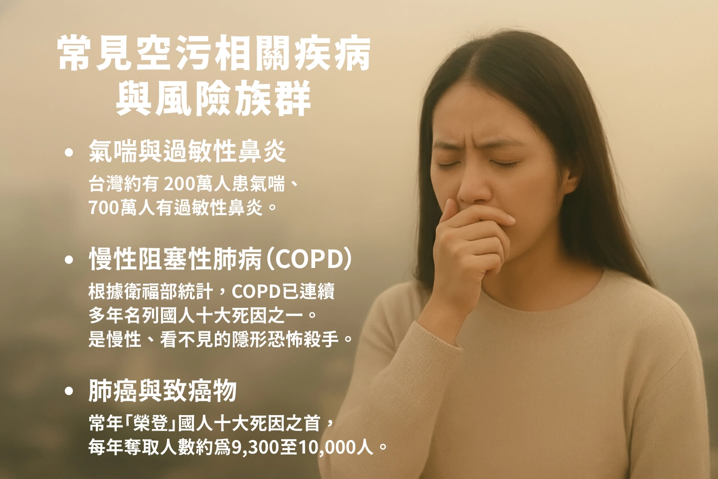 台灣約有200萬人患氣喘、700萬人有過敏性鼻炎。空污會破壞呼吸道組織,使塵蟎、黴菌等過敏原更易入侵,引發氣喘惡化與過敏反應。(資料來源:近年醫療與衛生單位推估和流行病學調查。以及依據台灣胸腔暨重症加護醫學(TSPCCM)及衛生福利部等統計,台灣成人氣喘盛行率約為7.5~11.5%,推算全台約有200萬氣喘患者。過敏性鼻炎的部分,多份統計和衛教資料提及台灣約每三人就有一人鼻過敏,換算約700萬人左右。)