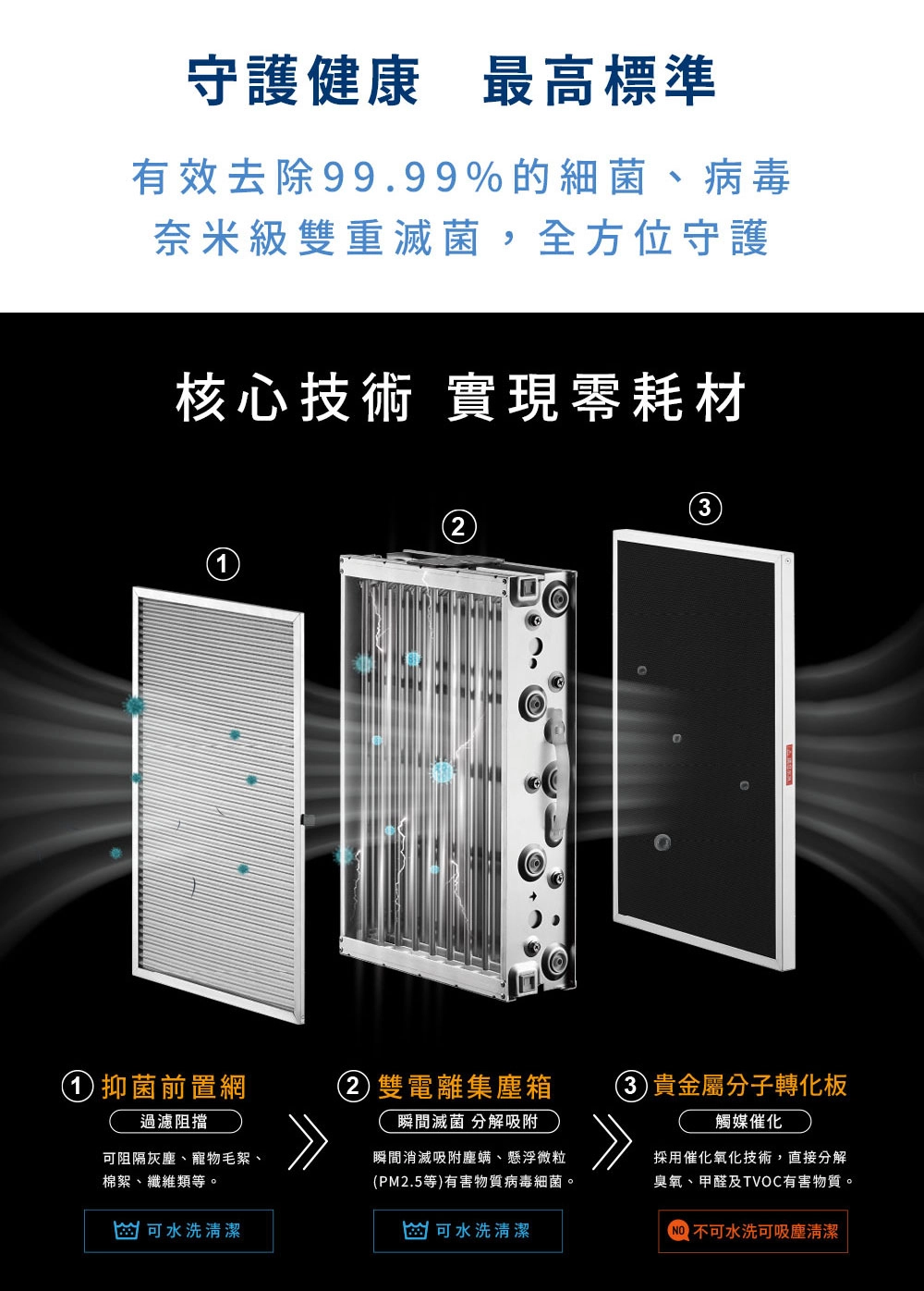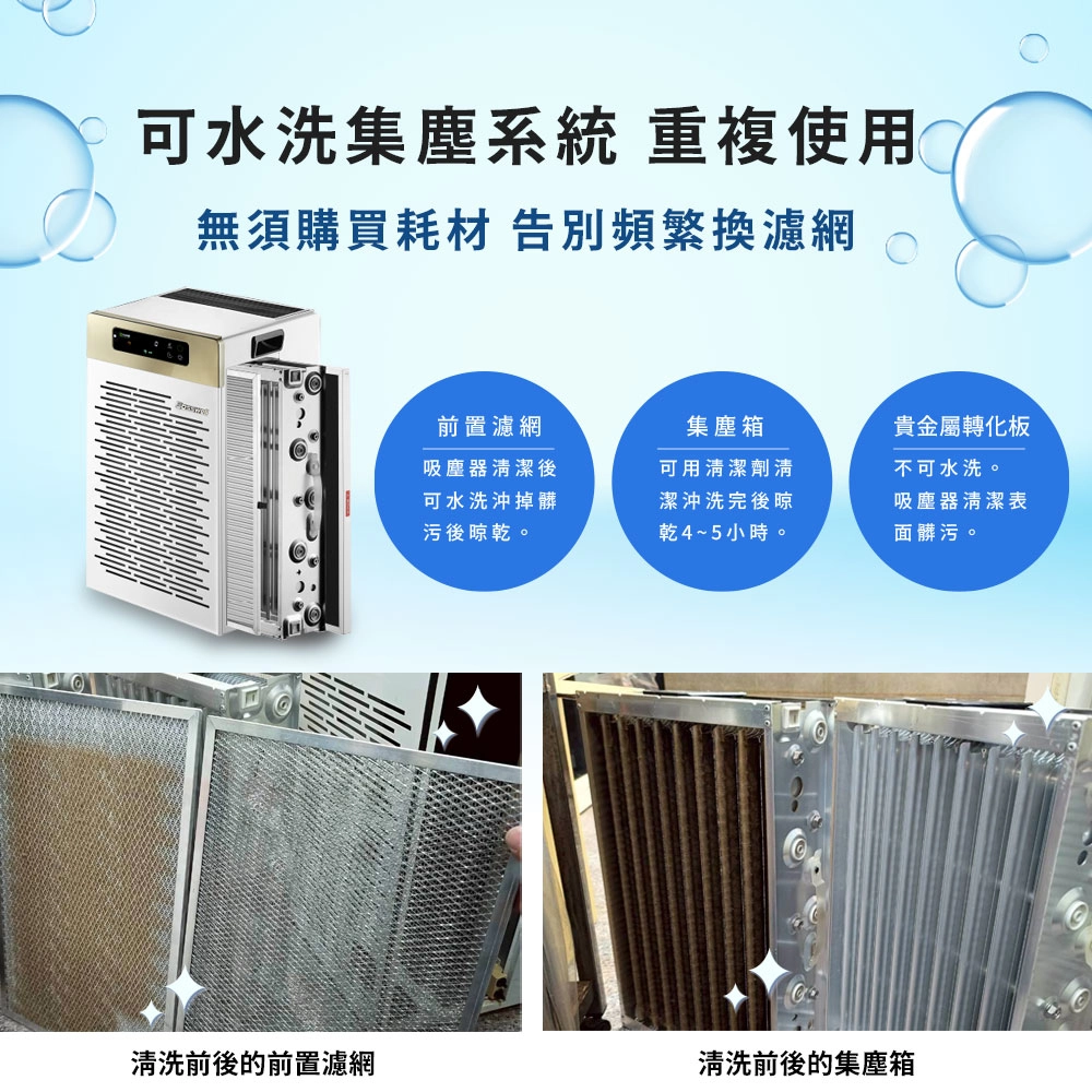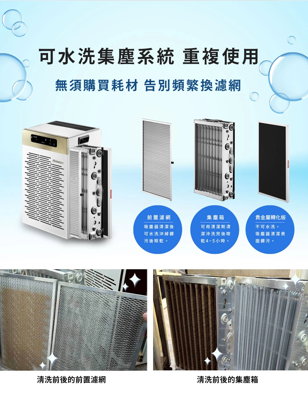 一台無須更換濾網,水洗快乾重複利用獨家!即時髒污偵測技術,給你好空氣環繞生活!