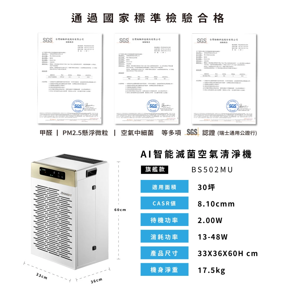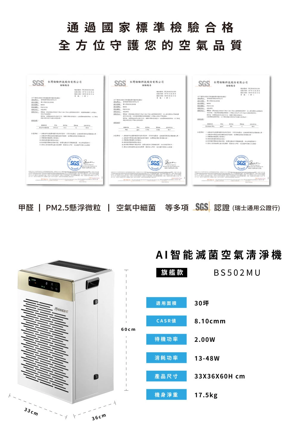 AI智能滅菌空氣清淨機 旗艦款 30坪內 BS502MU