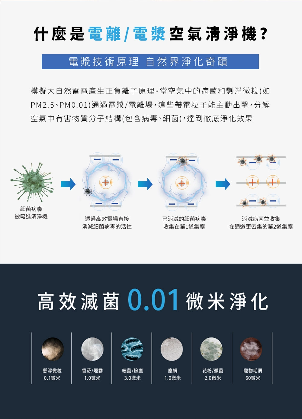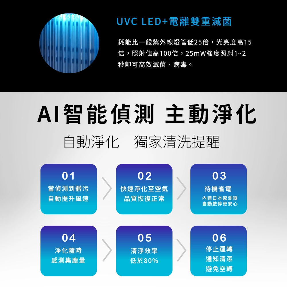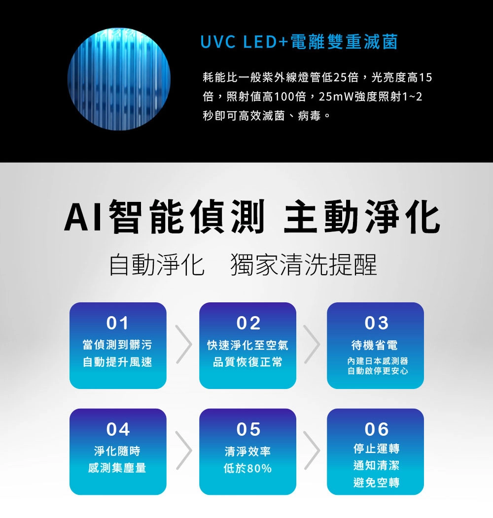 - 雙重過濾︱雙電離技術+UVC LED,過敏剋星,強效滅絕99.9%病毒