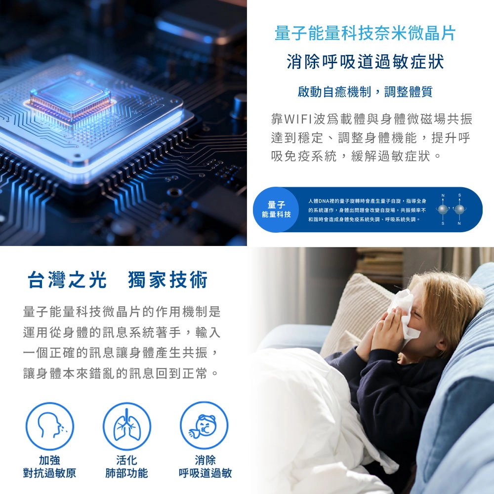 - 量子能量:類似舒曼波,與身體磁場共振,穩定機能,強化呼吸與免疫系統,緩解過敏。
