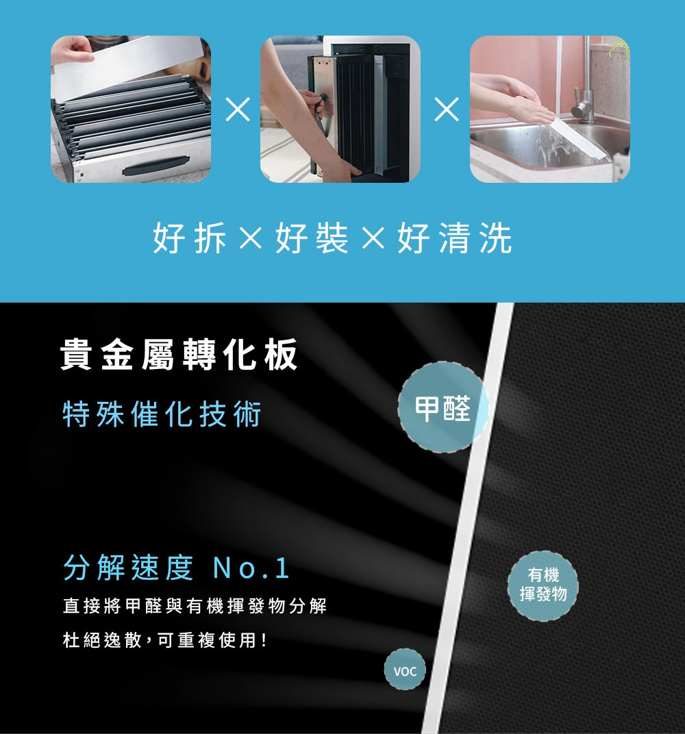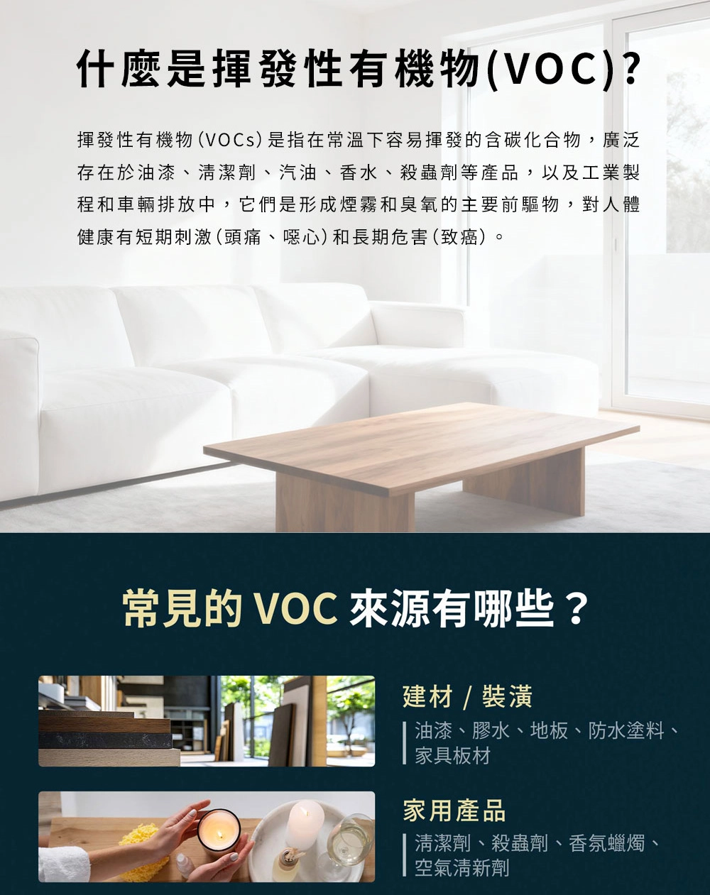 - 升級VOC(揮發性有機物)+PM2.5雙感測器,偵測空氣中污染氣體