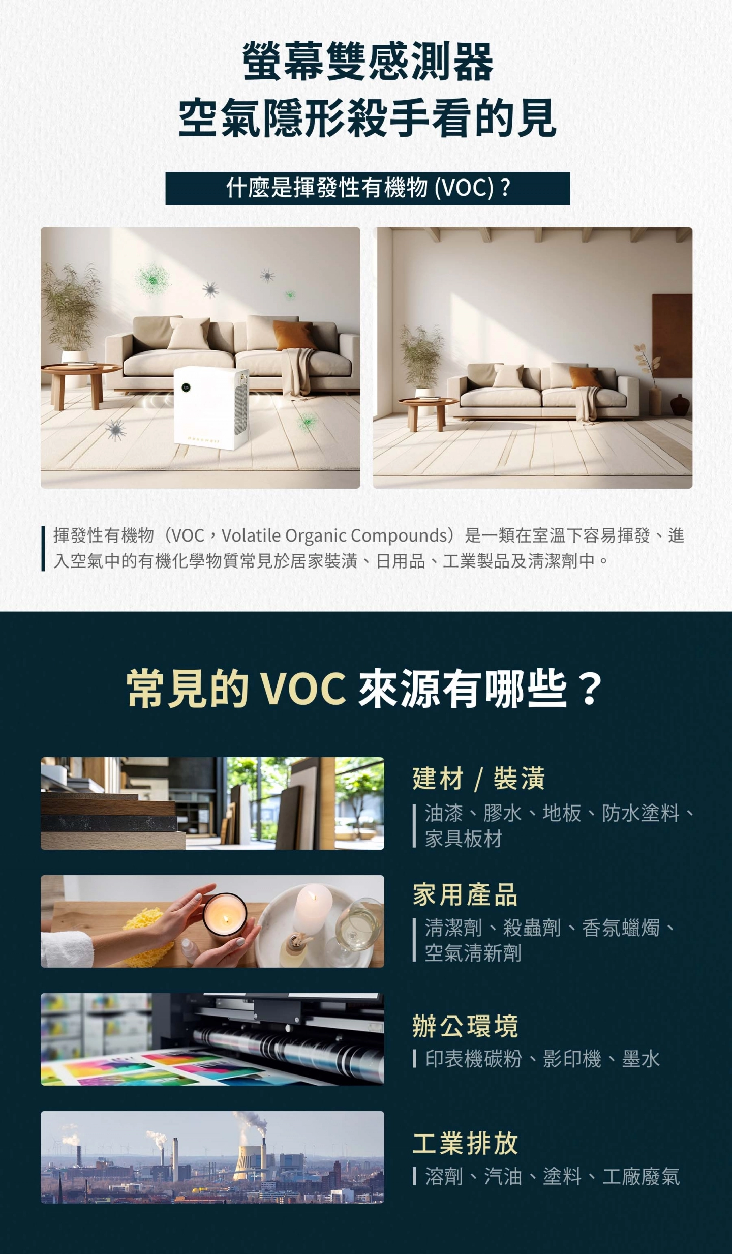 - 升級VOC(揮發性有機物)+PM2.5雙感測器,偵測空氣中污染氣體